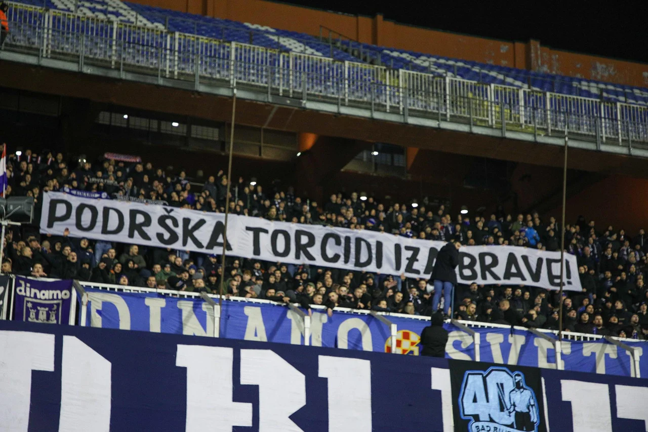 Na transparentu je bila ispisana poruka „Podrška Torcidi iza brave!“, dok su se s tribina istovremeno orili stihovi pjesme „Hrvatska mati me rodila“ u izvođenju Tomislav Brajša.