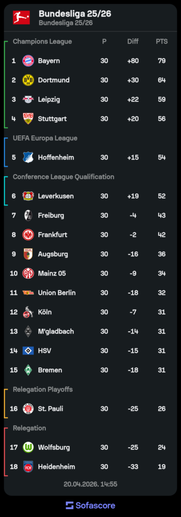 Bayern je naslov osvojio s 25 pobjeda, četiri remija i jednim porazom u 30 utakmica. Zabili su 109 i primili 29 golova. Postavili su novi rekordi po broju postignutih golova, a imaju priliku još više otežati protivnicima, ali i samima sebi da ga obore jer su ostala još četiri kola do kraja.