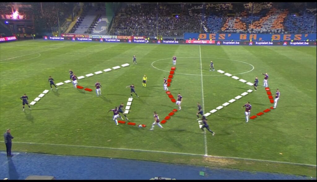 Plavi su utakmicu započeli sa Šabićem i Odinakom na krilima. Često je pomenuti dvojac ulazio u poluprostor te na taj način ostavljao širinu za svoje bočne igrače. To je ono što često gledamo od Želje — čak su i pod vodstvom Stojanovića bočni igrači imali zadatak ulaska unutra i kreiranja prostora za “čovjeka s loptom”.