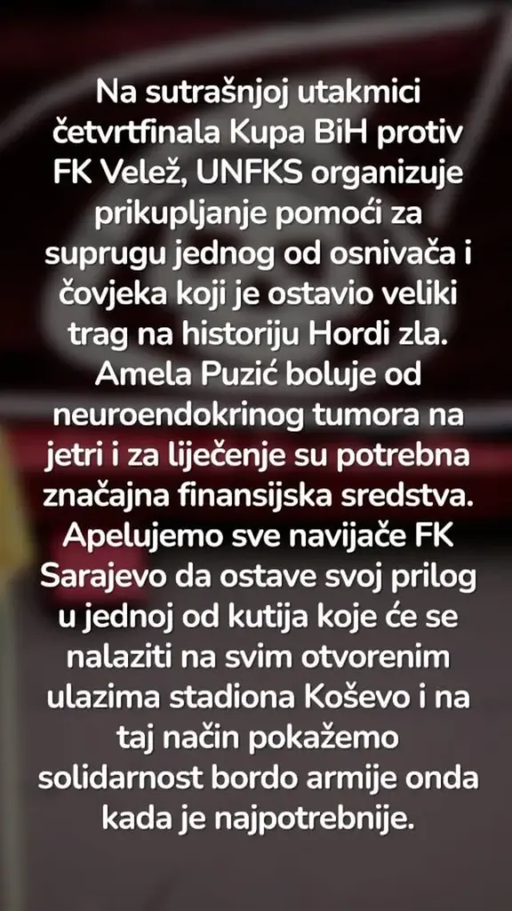 Na sutrašnjoj utakmici četvrtfinala Kupa Bosne i Hercegovine protiv Veleža, UNFKS organizuje akciju prikupljanja pomoći za suprugu jednog od osnivača i čovjeka koji je ostavio dubok trag u historiji Hordi zla.