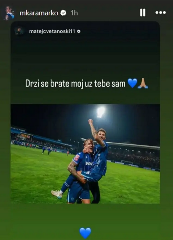 Poruka podrške stigla je i sa Grbavice. Brz oporavak Karamarku je poželio Matej Cvetanoski, koji je nedavno slomio obje poktkoljenične kosti.