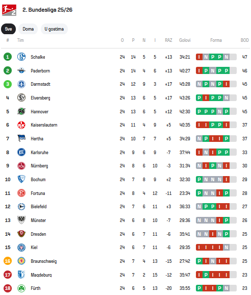 Schalke je lider na tabeli sa 47 bodova, slijedi Paderborn sa 46, a po 45 bodova imaju Darmstadt, Elversberg i Hannover.