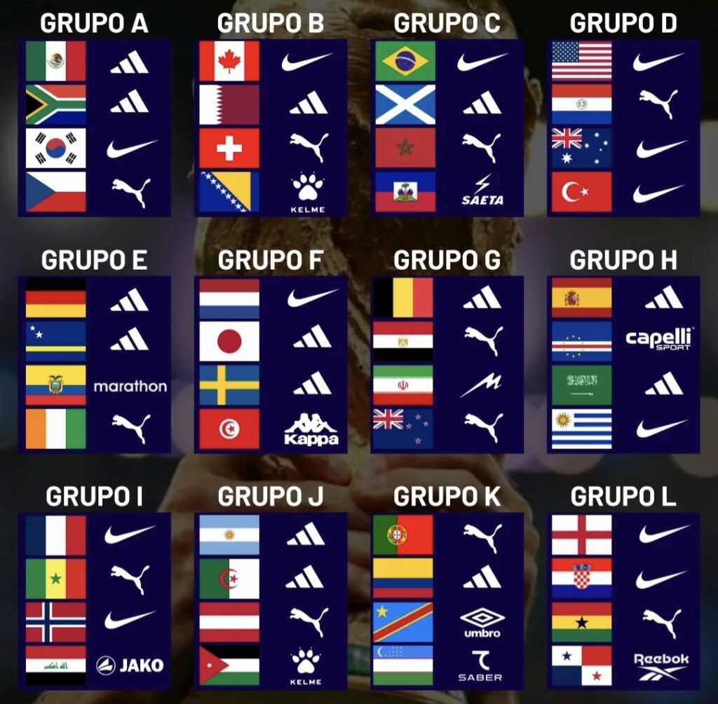 Ovo je grafika koja prikazuje svih 48 reprezentacija podijeljenih u 12 grupa na predstojećem Svjetskom prvenstvu 2026., uz njihove sponzore opreme.