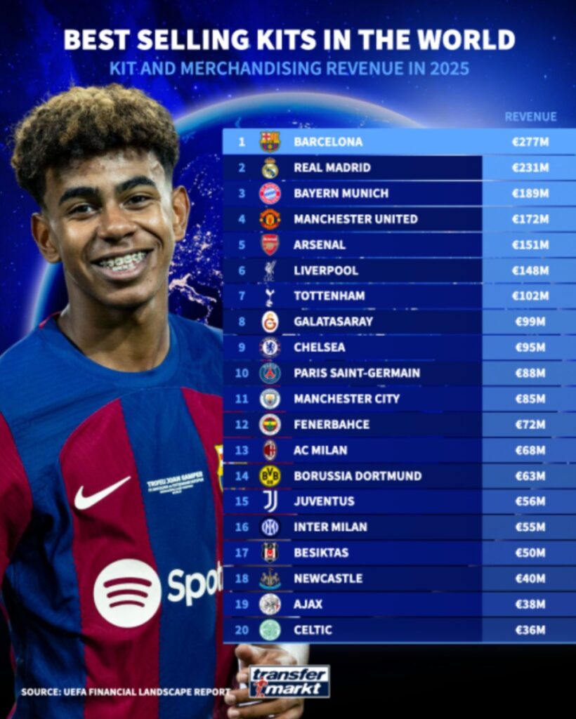 Prema tim podacima, klub s najvećim prihodima od merchandisinga i prodaje opreme u 2025. godini bio je španski velikan Barcelona, sa zaradom od 277 miliona eura. Taj iznos predstavlja rast od 63% u odnosu na godinu ranije i čak 46 miliona više od drugoplasiranog Real Madrid. Kao što tabela pokazuje, katalonski klub je uvjerljivo ispred ostatka Evrope, dok je treće mjesto pripalo Bayern Munchen, čiji su prihodi od prodaje opreme porasli za 11% i dostigli 189 miliona eura — što bavarski klub praktično čini trećim najpopularnijim na svijetu po ovom kriteriju.