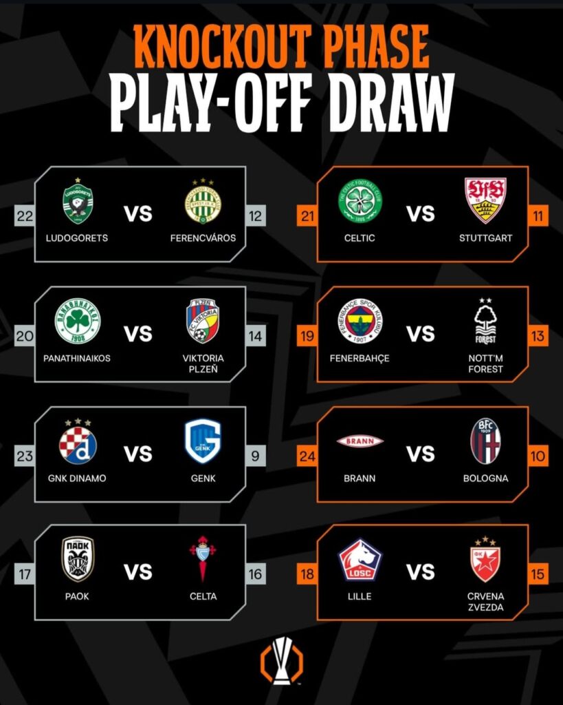 Danas je održan žrijeb play-off faze Europa lige. Utakmice su na rasporedu 19. i 26. februara, a pobjednici idu u 1/8 finala gdje ih čeka prvih 8 ekipa iz grupne faze.