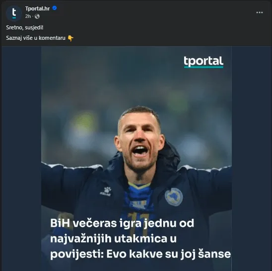 Hrvatski portal Tportal.hr najavio je večerašnji susret, a na društvenim mrežama uputio je poruku podrške reprezentaciji Bosne i Hercegovine uz kratku poruku:
