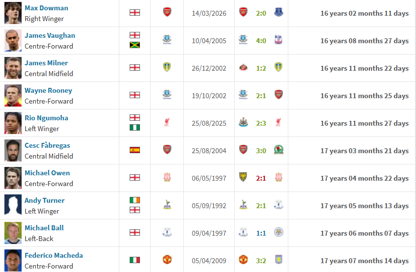 Slika iznad vam govori top 10 najmlađih strijelaca u historiji Premier lige. Velika su imena tu poput Rooneya, Owena, Fabregasa, Milnera… U ovom članku vam donosimo priču o novom wonderkidu s ostrva, Maxu Dowmanu.