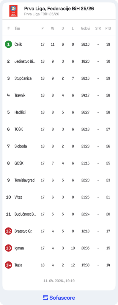 Na čelu tabele nalazi se Čelik sa 39 bodova, dok su Jedinstvo Bihać i Stupčanica uprkos današnjim porazima u Tuzli i Hadžićima zadržali visoke pozicije na tabeli.