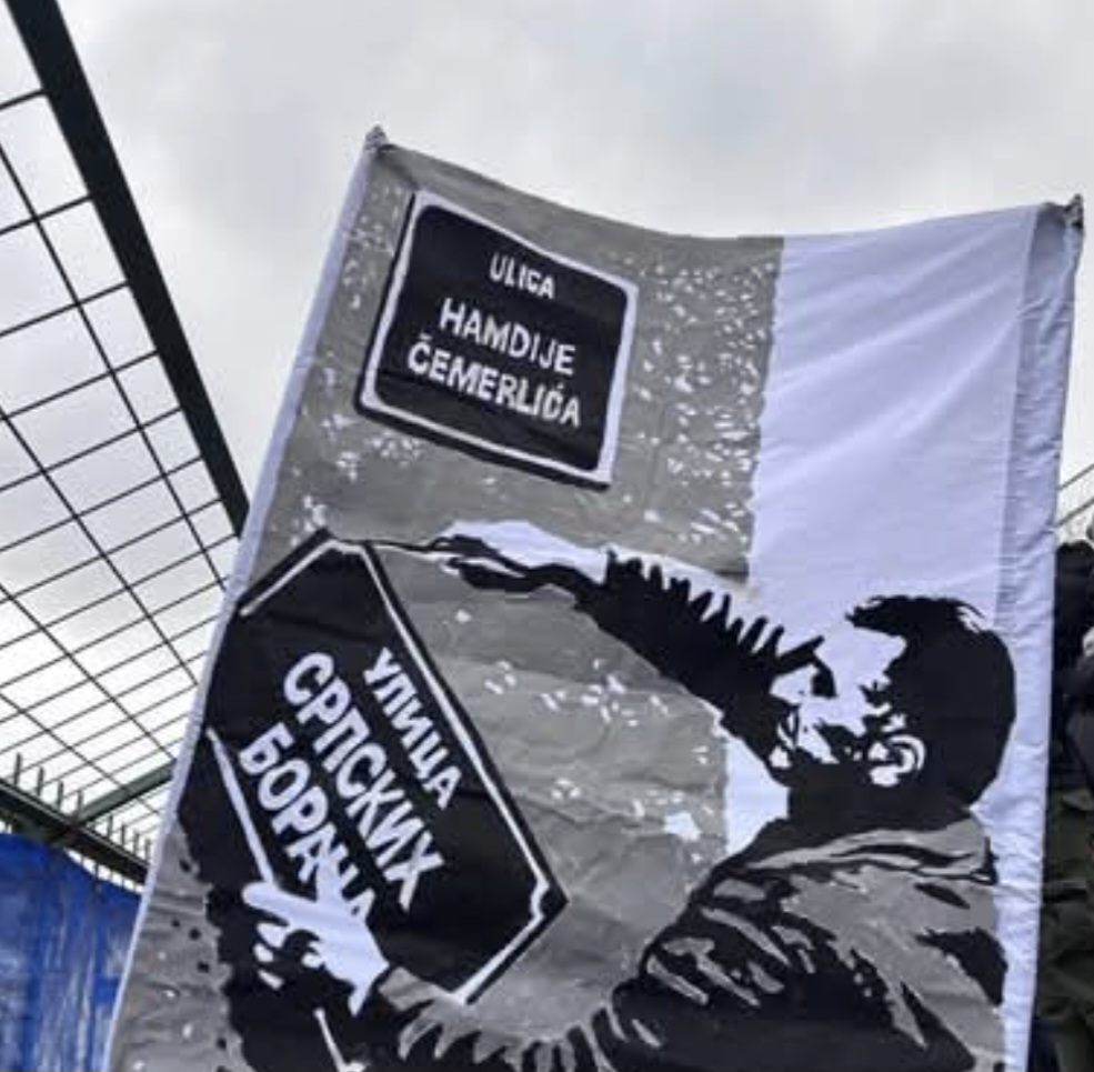 Naime, radi se o transparentu, odnosno zastavi koja je obilježila reintegraciju Grbavice. Na njoj je naslikana situacija u kojoj se, nakon reintegracije Grbavice, mijenja ime ulice i sklanja srpski agresor, a vraća ime ulice Hamdije Čemerlića.