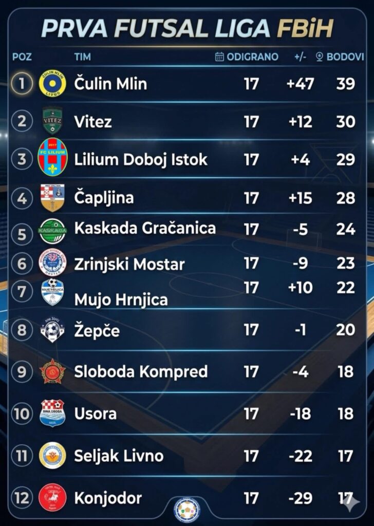 Trenutna tabela 1. Futsal lige FBiH
