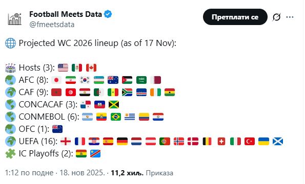 Renomirani analitički portal Football Meets Data objavio je svoju projekciju selekcija koje vidi na predstojećem Mundijalu. Nažalost, prema njihovim procjenama, BiH se ne nalazi među ekipama koje bi trebale izboriti plasman s evropskog kvalifikacijskog puta.